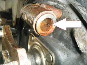 大量の錆によリシリンダとピストンが固着しています。ペダルを踏んでも効かない、または踏んでいない時もブレーキが効きっぱなしになるなどの症状です。